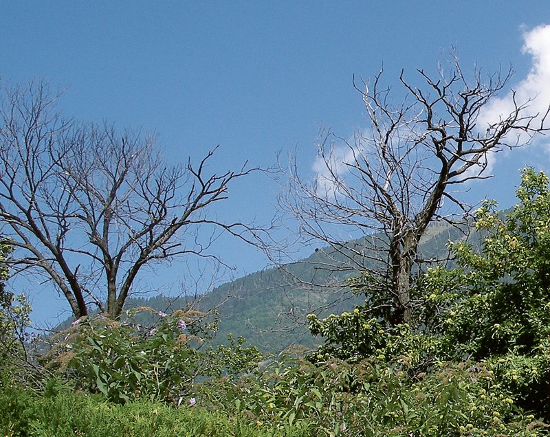 Fig. 1. Chestnut trees infected with chestnut blight near Collonges (Valais). After a long-standing infection, a large portion of the crown has died off. Photo: Phytopathology WSL