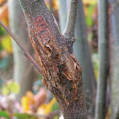 Cryphonectria parasitica infects the bark of stem and branches of its host trees. At the point of infection, the bark turns red (fig. 3), sinks inwards and later on cracks (fig. 4). In response, the tree attempts to cover the destroyed tissue and so-called bark cankers develop. As soon as a bark canker has girdled the entire branch or stem, the plant part above the point of infection dies. The leaves wilt, but do not fall. Wilted leaves during the growing season or brown hanging leaves in winter are a typical sign of chestnut blight that is visible from a long way off.