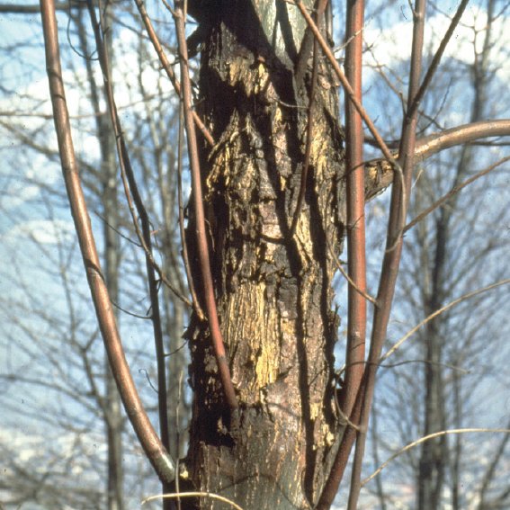 Below the bark cankers infected trees usually produce epicormic shoots (fig. 5). The fungus forms pale brown mycelial fans in the bark and cambium, which are a dependable sign of an infection (fig. 6). Finally, small yellow-orange to red fruiting bodies develop on the dead bark or in bark cracks (fig. 7). Hypovirulent strains of C. parasitica grow in the outer bark, producing only superficial cankers, which heal rapidly. Typically, many of these healed superficial cankers are blackish in colour (fig. 8).