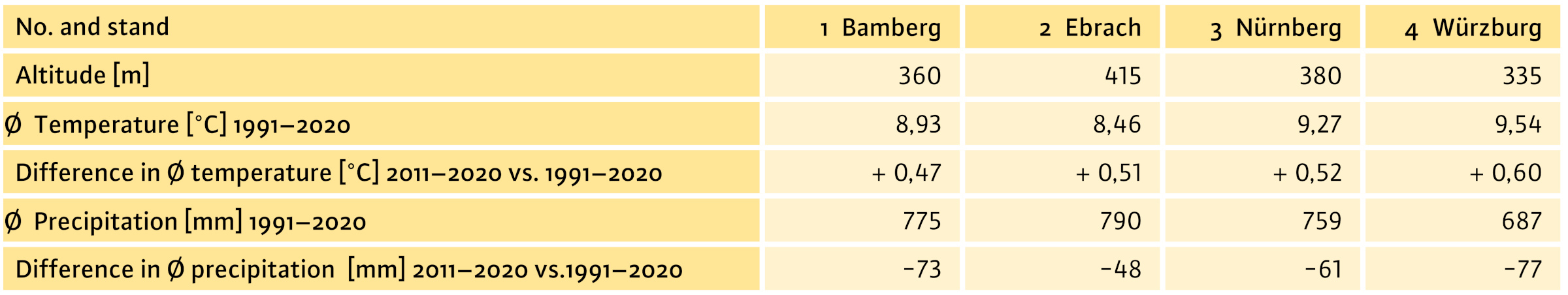 The four stands (Figure 2) are located at altitudes between 335 and 415 metres above sea level; steep and marginal locations were avoided. All sites recorded lower precipitation and higher temperatures in the period from 2011 to 2020 than the 30-year average (Figure 3).