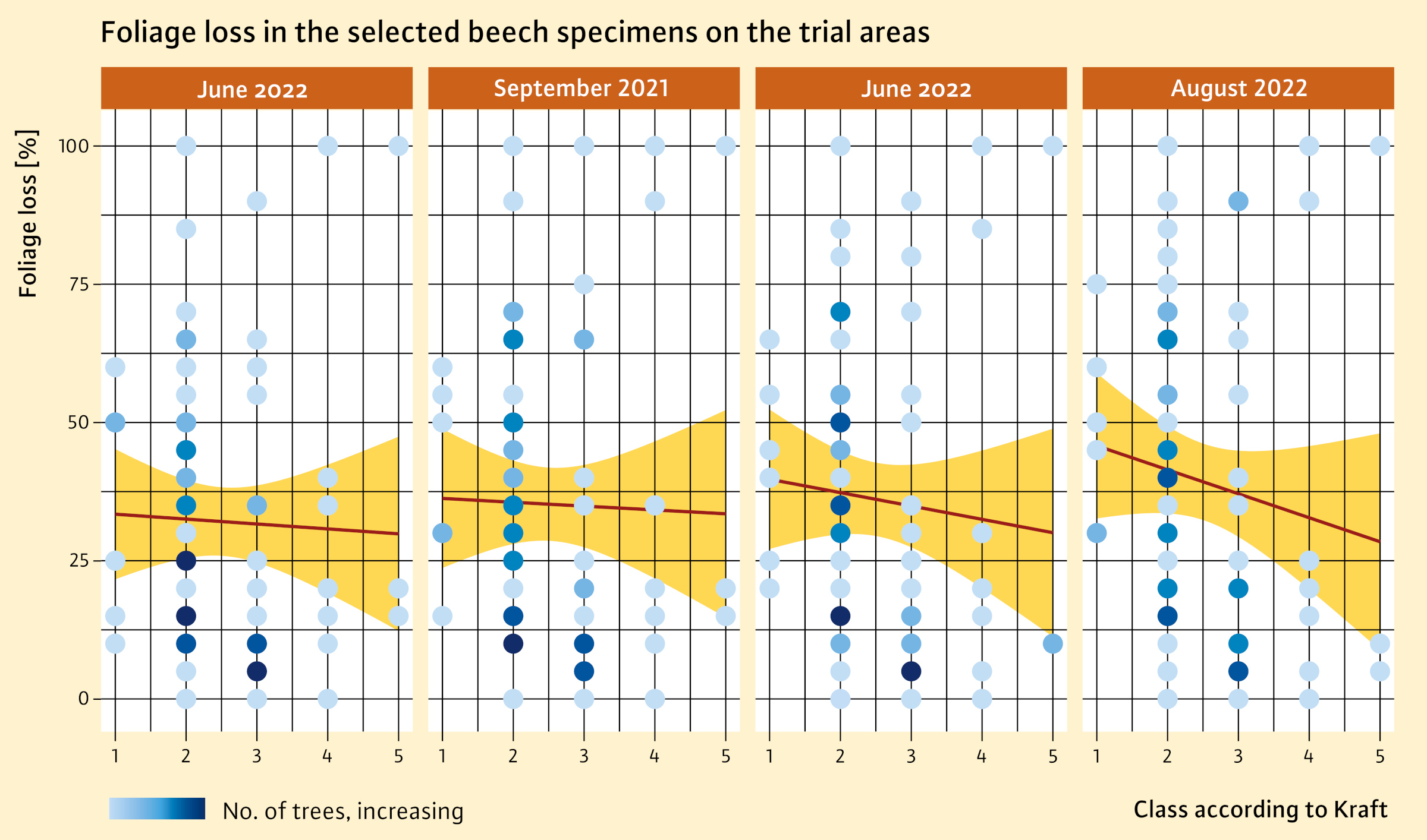 The observations on the progression of foliage loss were primarily to document the intensity and progression of the damage. The low number of specimens does not allow statistically reliable statements to be made - studies by Thurm et al. (2022) in Mecklenburg-Western Pomerania and by Mathes et al. (TUM, Chair of Forest and Agroforestry Systems; unpublished) are however in line with the results of our studies on the states of vitality. Thurm et al. found that especially old-growth stands and stands of lower density are more likely to be subject to foliage loss. In addition, Mathes et al. observed that previously crowded trees benefit when the crown dieback of previously dominant trees reduces competition for light and water.