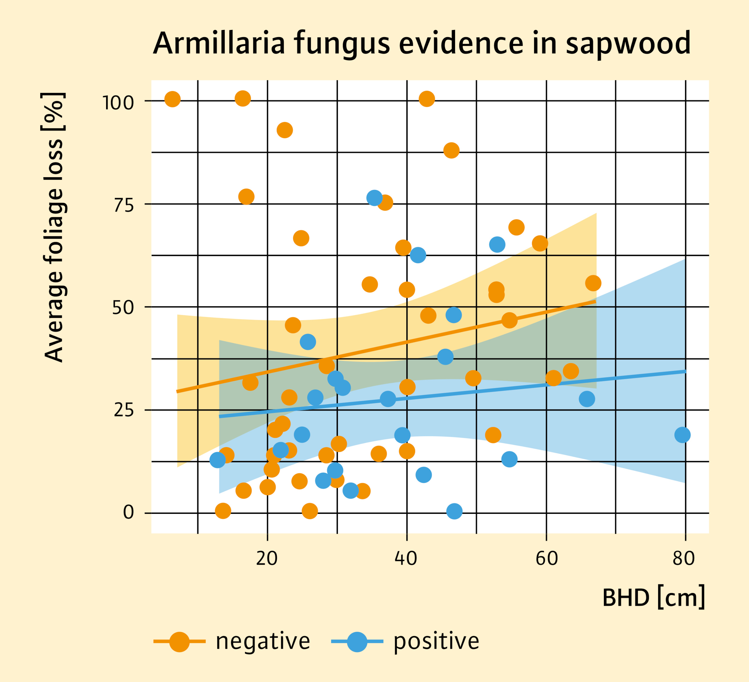 Armillaria was the most frequently detected fungus in the four study stands. The number of Armillaria detections varied depending on the method: the macroscopic examination of the trunk bases revealed that 33 % of the sample trees had decay caused by Armillaria fungi. Cultivation of the root samples on a nutrient medium showed Armillaria spp. in the root zone of half of the 70 trees. PCR analysis of drill samples yielded positive results in 33 % of the beech trees. Surprisingly, this method of investigation detected Armillaria fungi particularly in the seemingly healthy sapwood, and it was found mainly in samples from common beech with lower levels of leaf loss (Figure 6).
