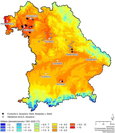 In autumn 2021, a chance discovery of Anthostoma hornbeam decline was made at a motorway rest area on the southern edge of the Franconian Plateau in Lower Franconia. This region around Würzburg is the warmest and driest in Bavaria. The discovery led to a total of 32 stands with larger proportions of hornbeam being surveyed there and in two other warm regions of Bavaria, around Regensburg and Nuremberg. No suspected cases were found around Regensburg and Nuremberg. The vitality of the trees there was obviously better than that of the hornbeams around Würzburg. On the Franconian Plateau, however, the fungus was detected in 8 of the 17 stands surveyed (Fig. 1). Additional findings at 3 of 7 inspected motorway rest areas with hornbeams in the area of the Franconian Plateau confirm that the pathogen occurs at sites where the trees are subject to stress. At one site, at least one third of the approximately two dozen trees was infected and already displayed spore deposits of A. decipiens and extensive necroses on the trunk. At a motorway rest area north of Regensburg, the disease was detected on a single, badly damaged hornbeam. However, further checks of hornbeams at 31 motorway rest areas around Regensburg were negative.
