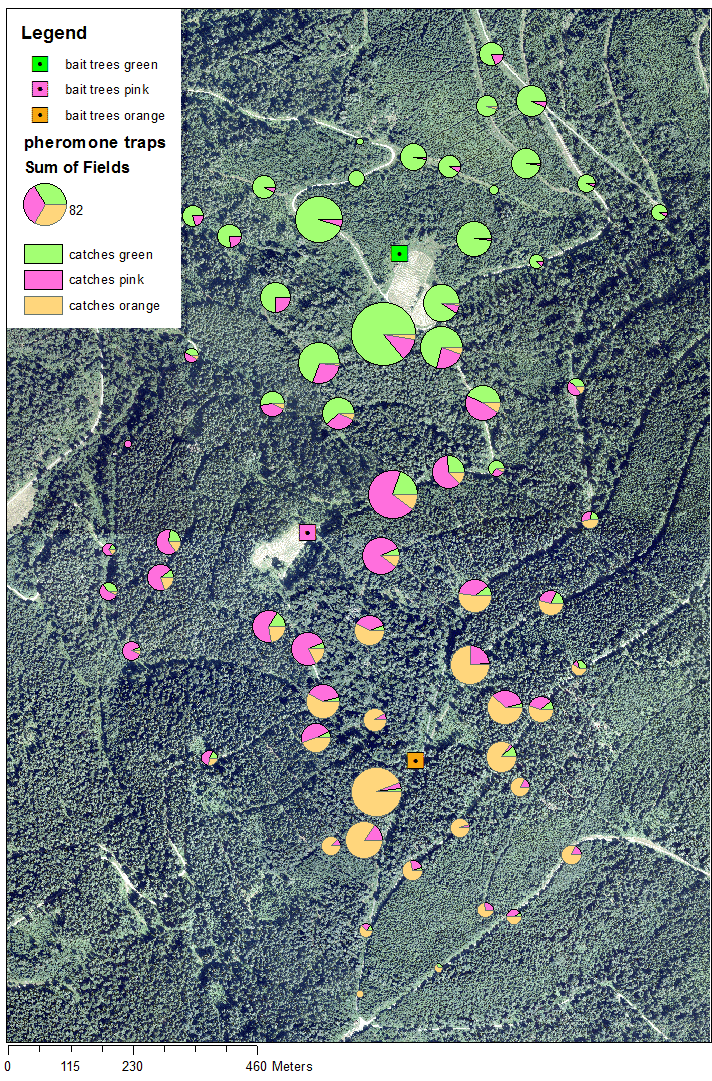 Thereupon it was possible to identify the marked beetles in approximately 60 pheromone traps, which were widely distributed within the study area to catch the bark beetles. Data from every corresponding pheromone trap was collected to identify spatial and structural preferences of I. typographus. Using data from the daily trap catches it was possible to draw conclusions about the spreading dynamics, the flight distances and the special preferences of the dispersing bark beetles. Subsequent analysis showed the age (young or old) and the sex of every single beetle caught and this allowed us to discover differences in spreading behavior.