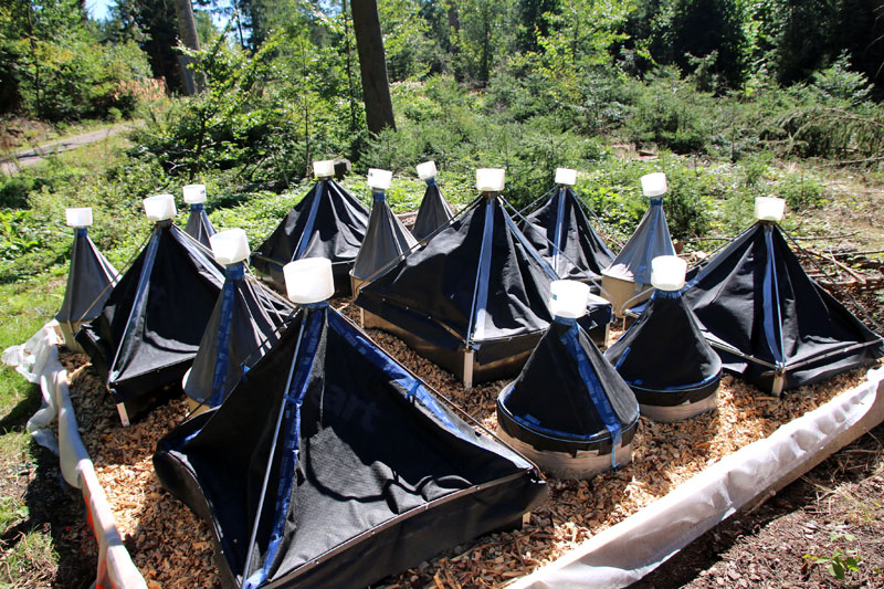 The same is true for the development of lethal temperatures in woodchip piles earlier in the year, when the sun is more intense than it was in the trial. The deliberate triggering of a fermentation process within the wood chip pile depends on its size (height and width), the weather, and essentially also on the composition of the wood chips, in particular the proportion of green needles. The likelihood of reaching a level of fermentation that is harmful to bark beetles when chipping mainly trunkwood is quite low.