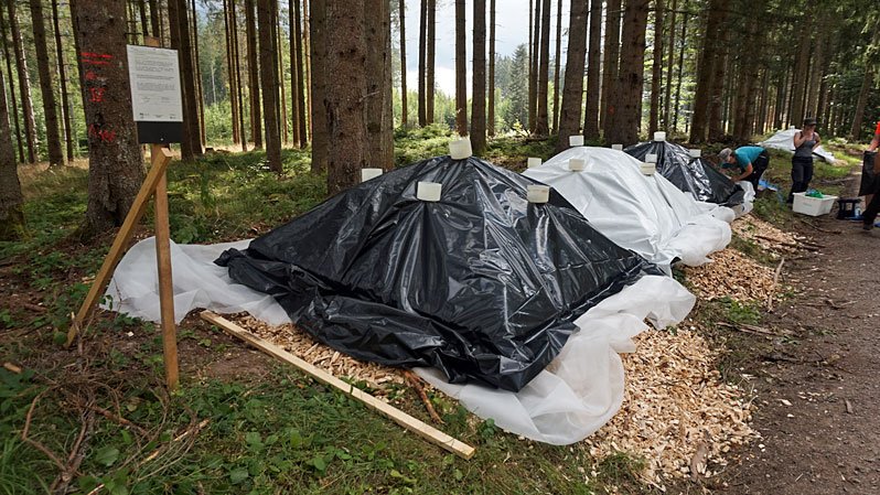 By recording the temperatures inside the wood chip piles during the trial period from mid-August to October, it was shown that lethal temperatures for the bark beetles were not reached even when the piles were covered with black foil. Evidence of an initially suspected fermentation process ("composting effect") could not be found.