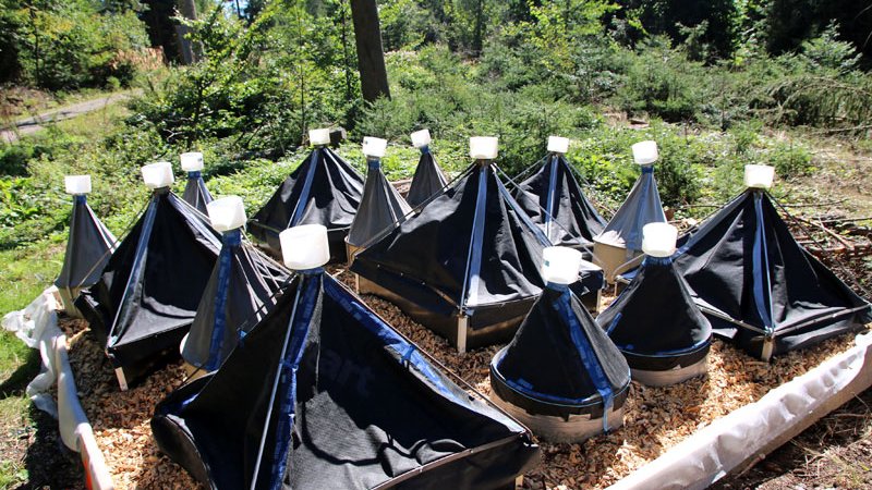 Since the use of plant protection products as a last resort was not always possible or desired, infested trunk wood was also chipped to treat it for bark beetles (Fig. 1), sometimes without the chips being used thermally as would usually be the case. In the late summer of 2020, a trial was carried out to test the effectiveness of this mechanical forest protection procedure in the southern Black Forest. In addition to the effects of the mechanical chipping process on the two important bark beetle species on spruce, the European spruce bark beetle, also known as the European eight-toothed spruce bark beetle (Ips typographus), and the smaller European spruce bark beetle, also known as the smaller European six-toothed spruce bark beetle (Pityogenes chalcographus), the potential effect of raising the temperature of the woodchip piles by covering them with black silage-wrapping film was investigated. It was also checked whether bark beetles still fly from wood chips spread out on the ground (Fig. 2).