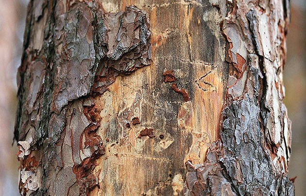 The infestation usually becomes visible from September because of the holes in the bark caused by woodpeckers. It is then possible to see the galleries (Fig. 5) of the spoon-shaped larvae with the cloud-like bore dust. The narrow oval exit holes from which the beetles emerge are often at an angle (Fig. 6). A less certain characteristic of jewel beetle infestation is the brown discolouration of the pine crown. This can also be caused by other damaging organisms or drought.