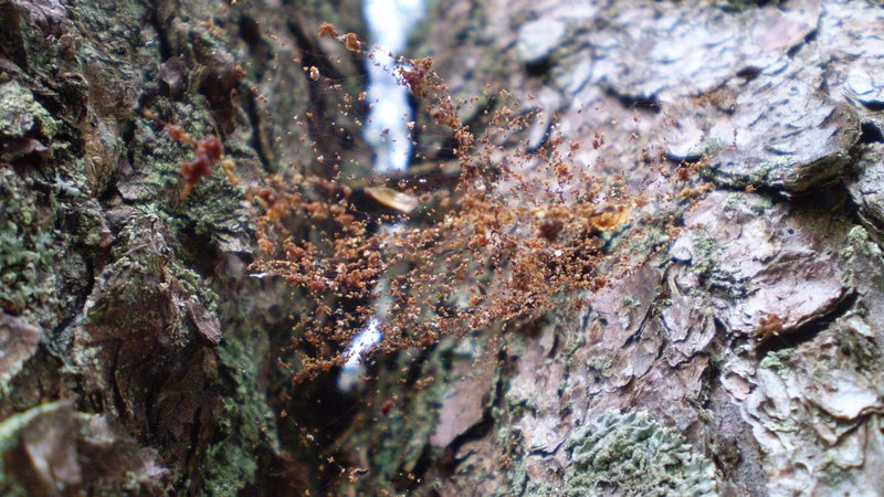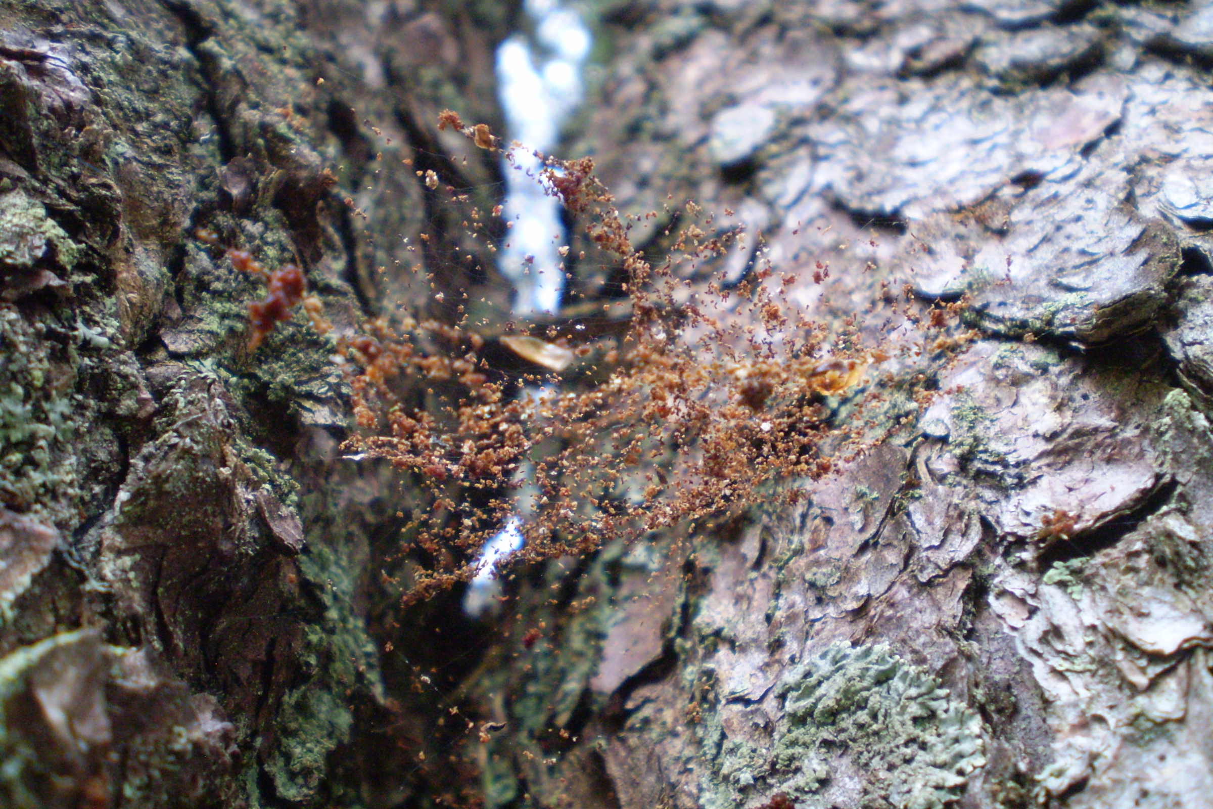 - On dead branches, branch forks or other surfaces that catch the falling bore dust;