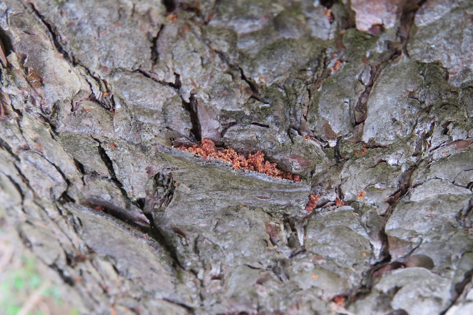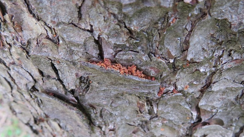 - Drill dust is to be found especially behind scales of bark; for this it is helpful to look very close to the trunk and from the top downwards - this is the best way to see behind scales of bark (Figure 6).