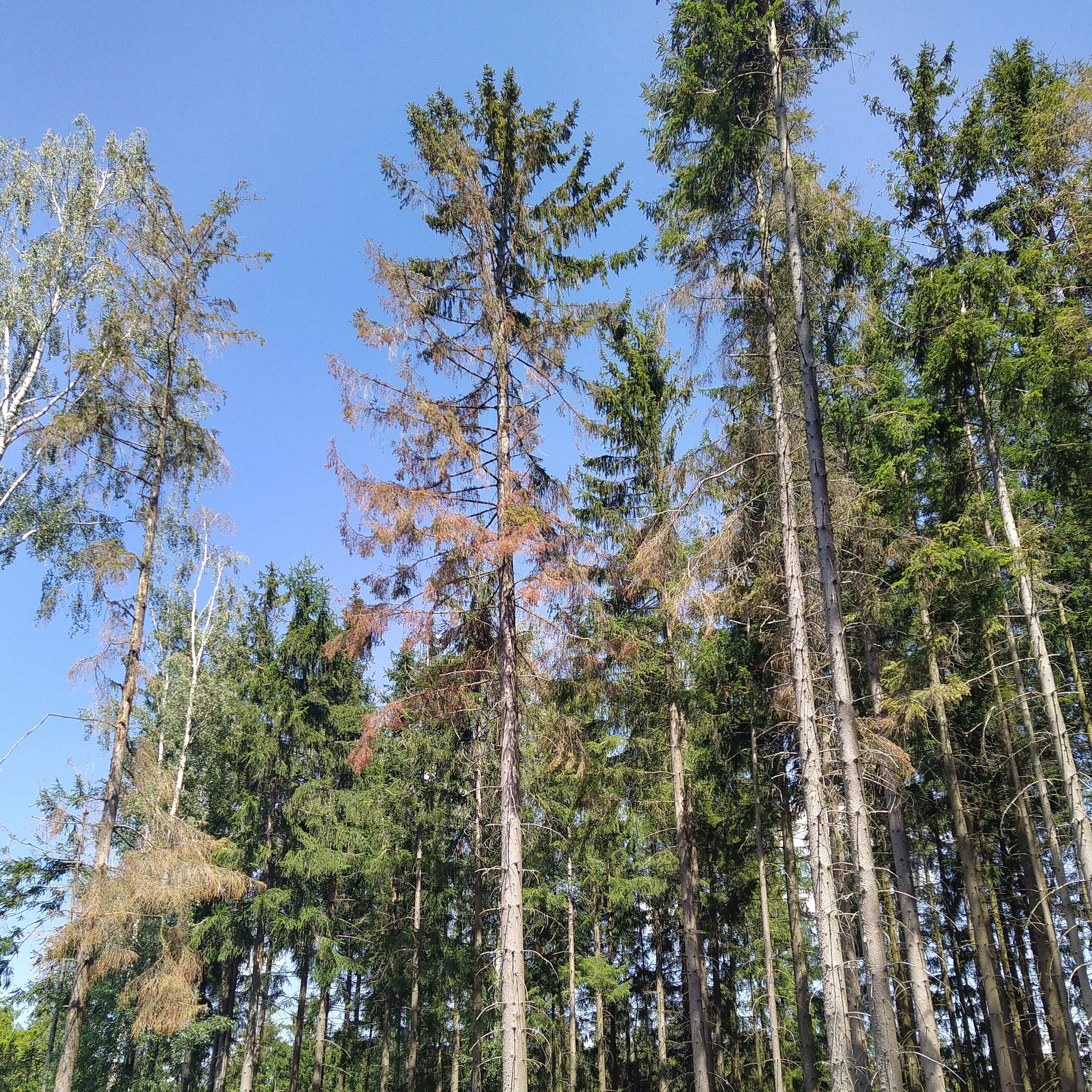 At temperatures above 30 °C, the eight-toothed spruce bark beetle will also retreat into the interior of the stand to infest trees there. Then the search for infestation should also be extended into the interior of the stand.