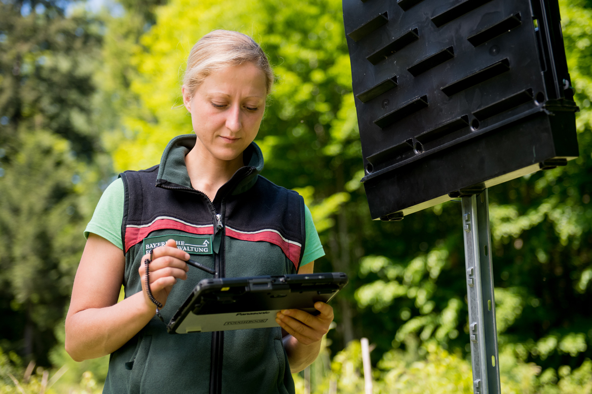 Figs 9 and 10: Bark beetle monitoring in Bavaria: Specialists at the LWF evaluate the data collected from traps and breeding trees in forest districts. The results are then linked to the current local situation assessment made by the Offices of Food, Agriculture and Forestry, and presented in Map form . Photos: Tobias Hase (StMELF)