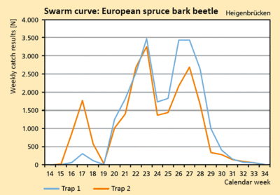 The heat wave in 2003 resulted in a mass propagation of the European spruce bark beetle (Ips typhographus) and the six-toothed spruce bark beetle (Pityogenes chalcographus). As a result, the Bavarian State Institute of Forestry (LWF) established a bark beetle monitoring program for these two species in early 2004. Up till then the beetles were only monitored at local hotspots. A region-wide and consistent surveillance of flight behavior and population dynamics of this pest was made possible with the new, uniform and consistent Bavarian wide system. Foresters and forest landowners can quickly receive information regarding the regional development of the beetles and therefore react in a timely manner to deploy appropriate counter measures.