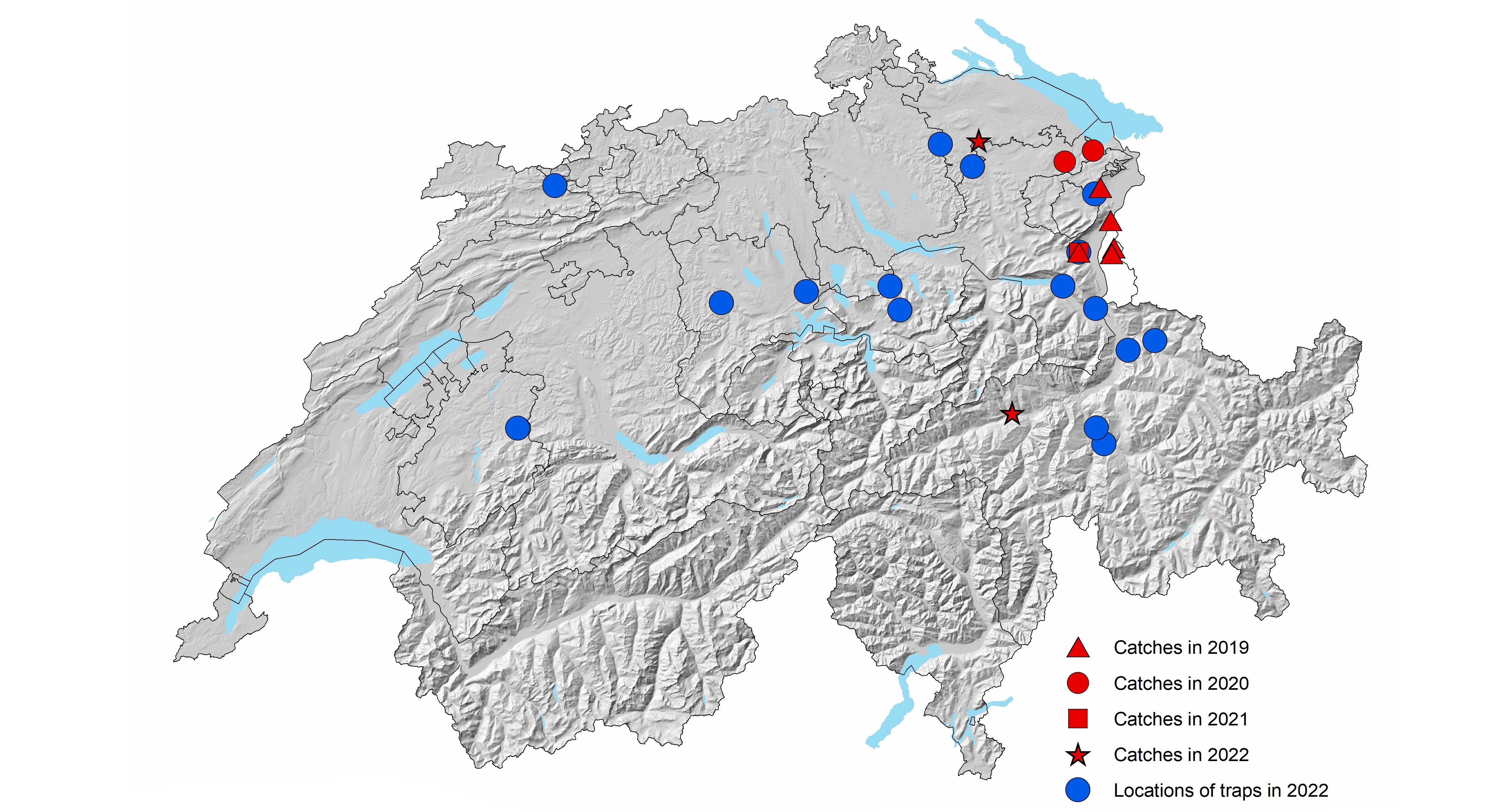 In 2021, these two sites were replaced by a new site in St Gallen and another in the canton of Thurgau. One northern bark beetle was also found at a trap site in Gams in the canton of St Gallen.