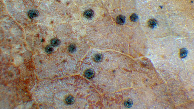 During winter and spring, the sexual fruiting bodies form on fallen leaves in the leaf litter (Fig. 3). These lenticular, dark brown or black fruiting bodies are around 0.2 mm in diameter and often have a sunken centre. Infested leaves are often found in the lower canopy or on young trees in the undergrowth.