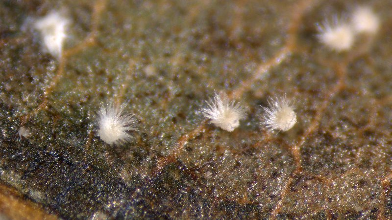 Brown spots develop on the living leaves infected by the fungus. The small white diaspores (Fig. 2) eventually appear on these, developing between June and October. These asexually formed diaspores serve – as do the sexual spores – to propagate the fungus and lead to secondary infections of the beech leaves. The initial infection of the leaves is favoured by wet spring days; wet summers in turn lead to increased secondary infections.