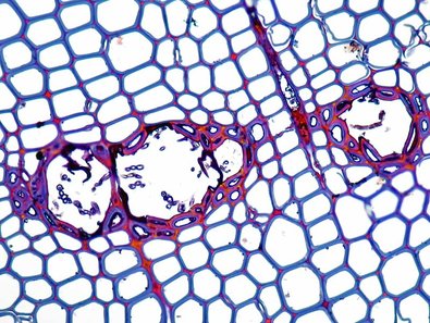 During systematic isolation testing slightly less than five times more wood-destroying fungi were isolated from spruce than from fir trees. The most frequently isolated wood-destroying fungus was the bleeding stereum fungus (Stereum sanguinolentum), that is to say, ten times in spruce trees, but only once in fir. Only in spruce trees was this red-striped pathogen also isolated three times from DBH slices, indicating the axial spread of this fungus in the trunk. As microscopic investigations show, this rapid axial spread in spruce is also clearly favoured by the colonisation of the resin ducts (Fig. 3). Other frequent wood colonisers in spruce were Neonectria fuckeliana, Phomopsis spp., Leptodontium beauverioides, Ascocoryne cylichnium and the blue stain fungus, Ophiostoma piceae. Conversely, by storing phenolic compounds, the fir is obviously largely able to prevent the desiccation of the wood (Fig. 4).