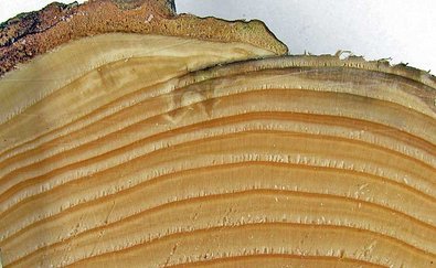 Fig. 3: The pre-formed resin ducts in the spruce quickly release resin; however, drying out encourages rapid axial colonisation of the tree body by fungi.