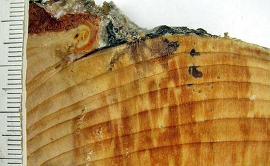 Fig. 2: In fir trees discolouration remains largely restricted to areas near the surface; rot is seldom seen.