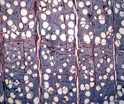 Fig. 4: Traumatic resin ducts also arise in fir trees in the new growth of wood around the edges of the injury (barrier zone). The additional storage of substances in the medullary rays prevent the wood from drying out (graduation mark = 100 µm).