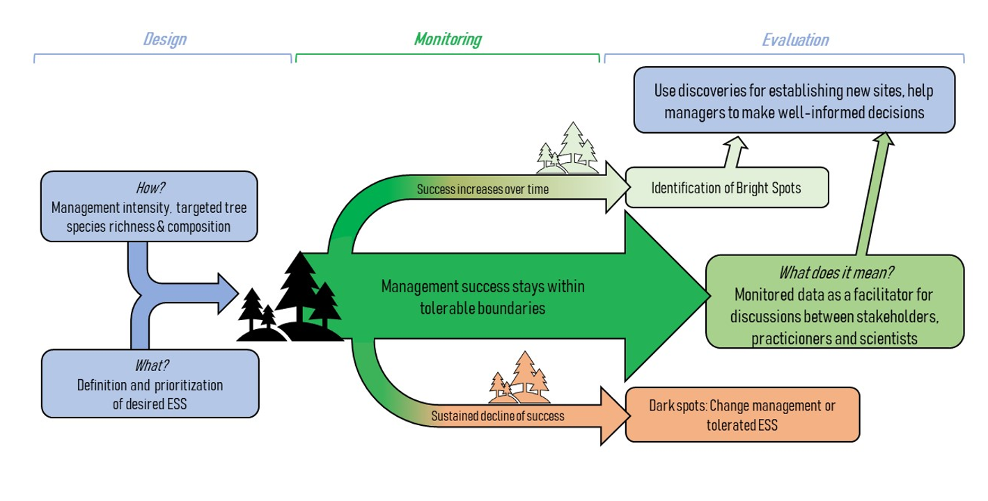 - Planning (Design): Determine which type and intensity of management will be tried and which ecosystem services are prioritized.