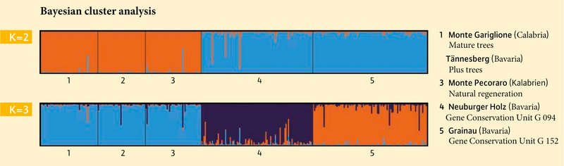 The results of the Bayesian cluster analysis show the best grouping with two (K=2) and three gene pools (K=3) (Figure 7). With two assumed clusters (K=2), the deltaK value is 166, thus showing a strong distinction between the Calabrian and Bavarian fir stands. A further grouping results at K=3 indicates the two other Bavarian populations are very different. This means that the plus trees growing on trial sites in Bavaria can be clearly assigned to the Calabrian gene pool.