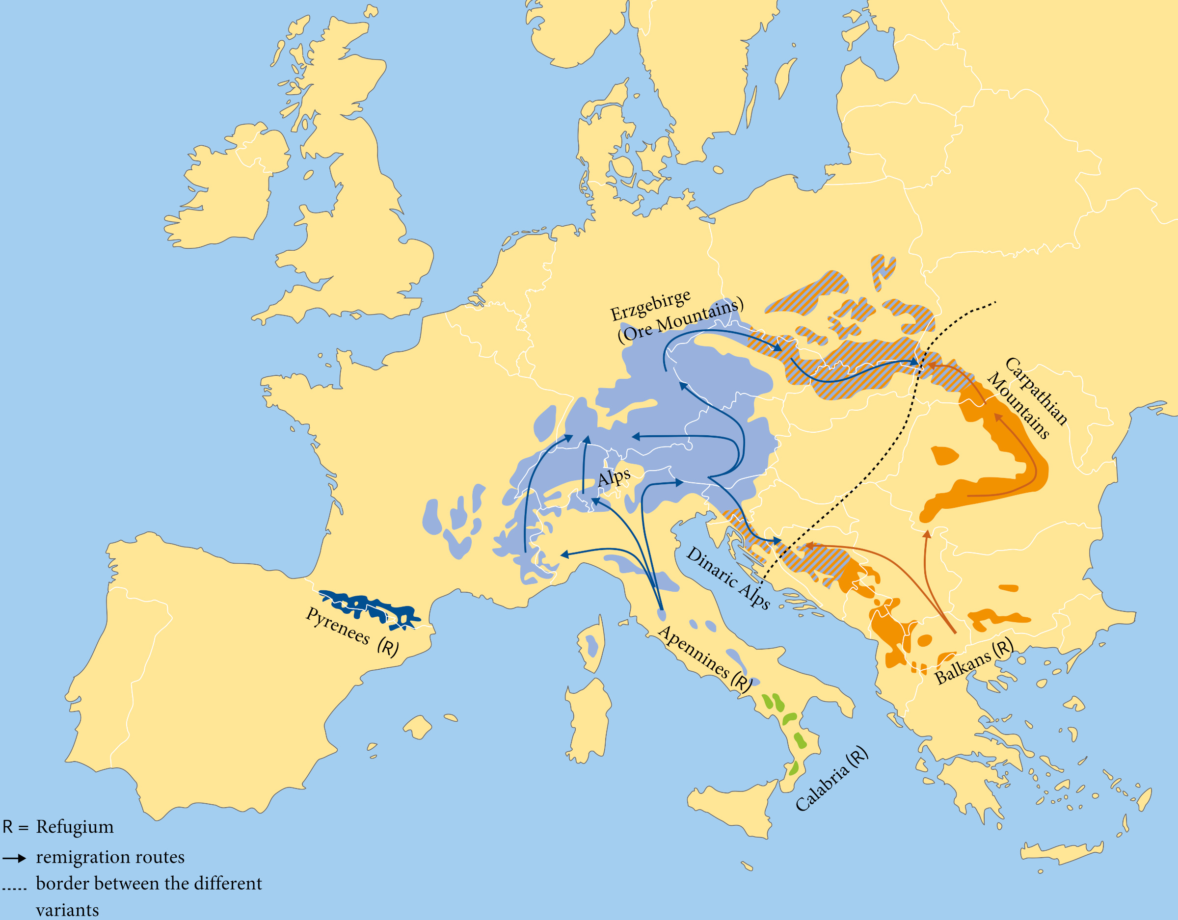 According to Neophytou (2015), silver fir survived the last ice age in various refugia (Figure 3). The species returned to Germany after the last ice age via different remigration routes (eastern/western Alps) and resulted in the current distribution patterns in Bavaria/Germany. The Calabrian silver fir did not find its way to Bavaria by natural means and is particularly interesting in the context of climate change due to its high genetic diversity.