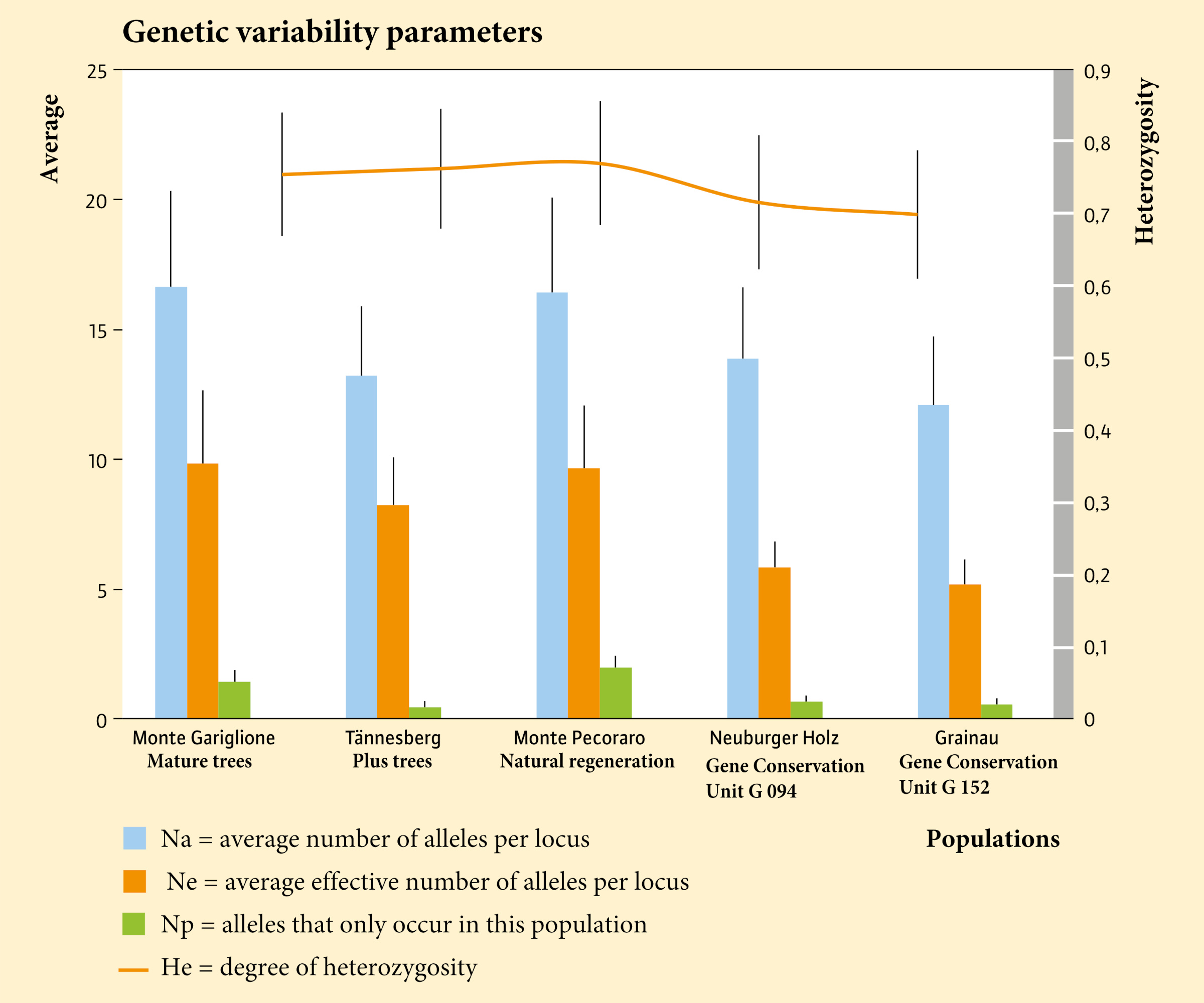 The observed heterozygosity (Ho) also varied in all populations studied, ranging from 0.701 (Grainau Genetic Conservation Unit) to 0.783 (Tännesberg), with a mean value of 0.741. The expected heterozygosity (He) also varied in all populations studied, ranging from 0.700 (Grainau Genetic Conservation Unit) to 0.771 (Monte Pecoraro), with a mean value of 0.741 (Figure 5). Heterozygous individuals have two different gene variants at one gene locus. This is like a safety net. If one allele does not work, the other allele could carry a variation that copes better with the conditions encountered.
