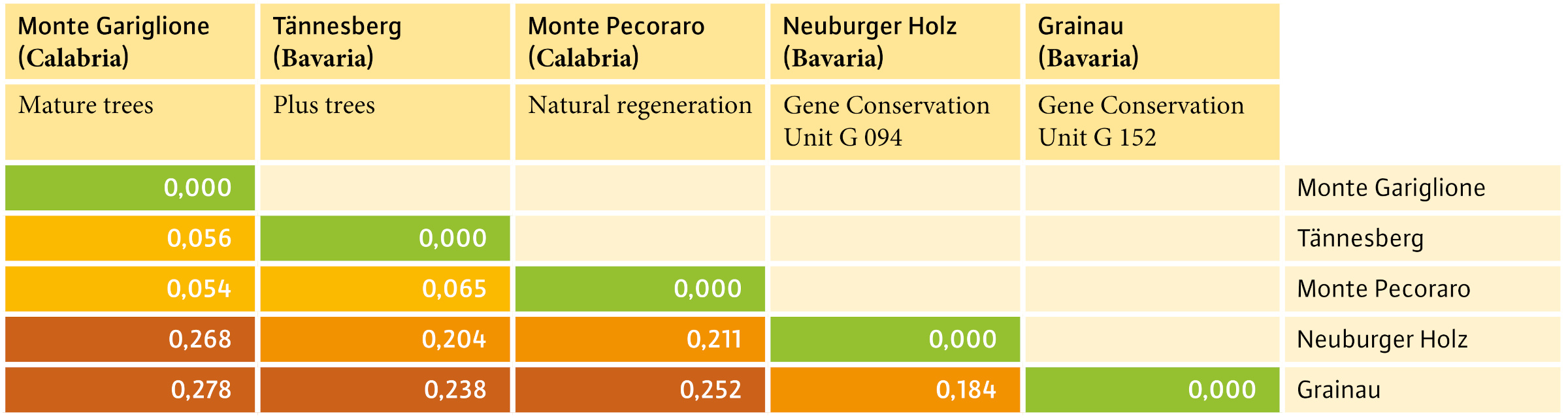 The genetic distance matrix according to Nei (1972) (Figure 6) shows large genetic distances between the Calabrian and Bavarian provenances (0.20-0.28). By contrast, genetic distances between the Calabrian populations are very small (0.05-0.06). Plus trees obtained from the Calabrian provenance in the Tännesberg provenance trial also match very well with the fir samples currently being collected in Calabria. This means that the “Calabrian fir” provenance in the provenance trial is very likely to come from Calabria and the genetic markers used identified Calabrian fir efficiently.