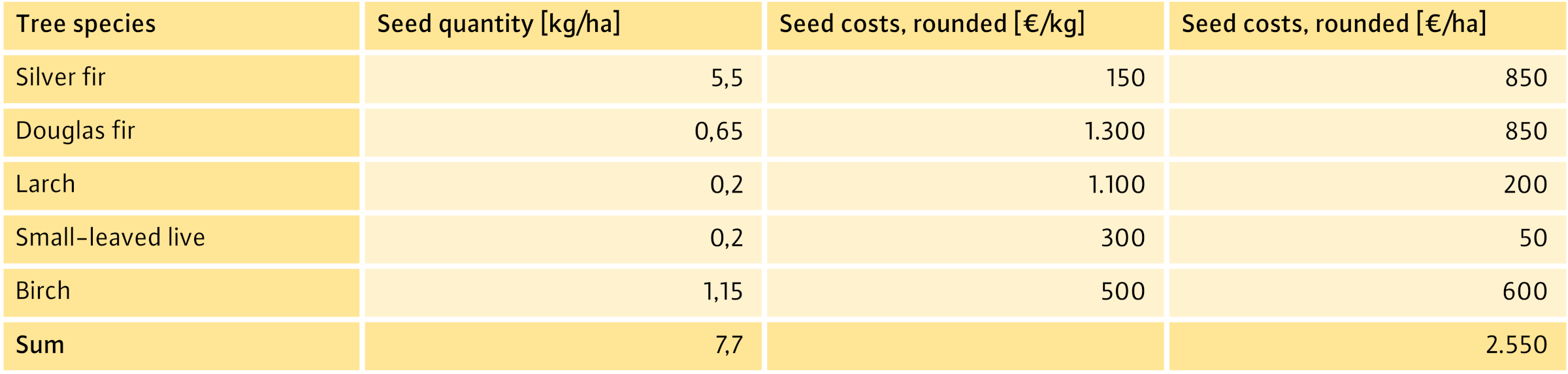 The costs of the seed and the task of sowing itself were borne by the Bavarian Forestry Administration as part of the pilot trial. The forest owners had to bear the costs of the fencing and, as part of a longer-term contractual arrangement, assume responsibility for subsequent fence control and maintenance, and allow unrestricted access for scientific surveys.