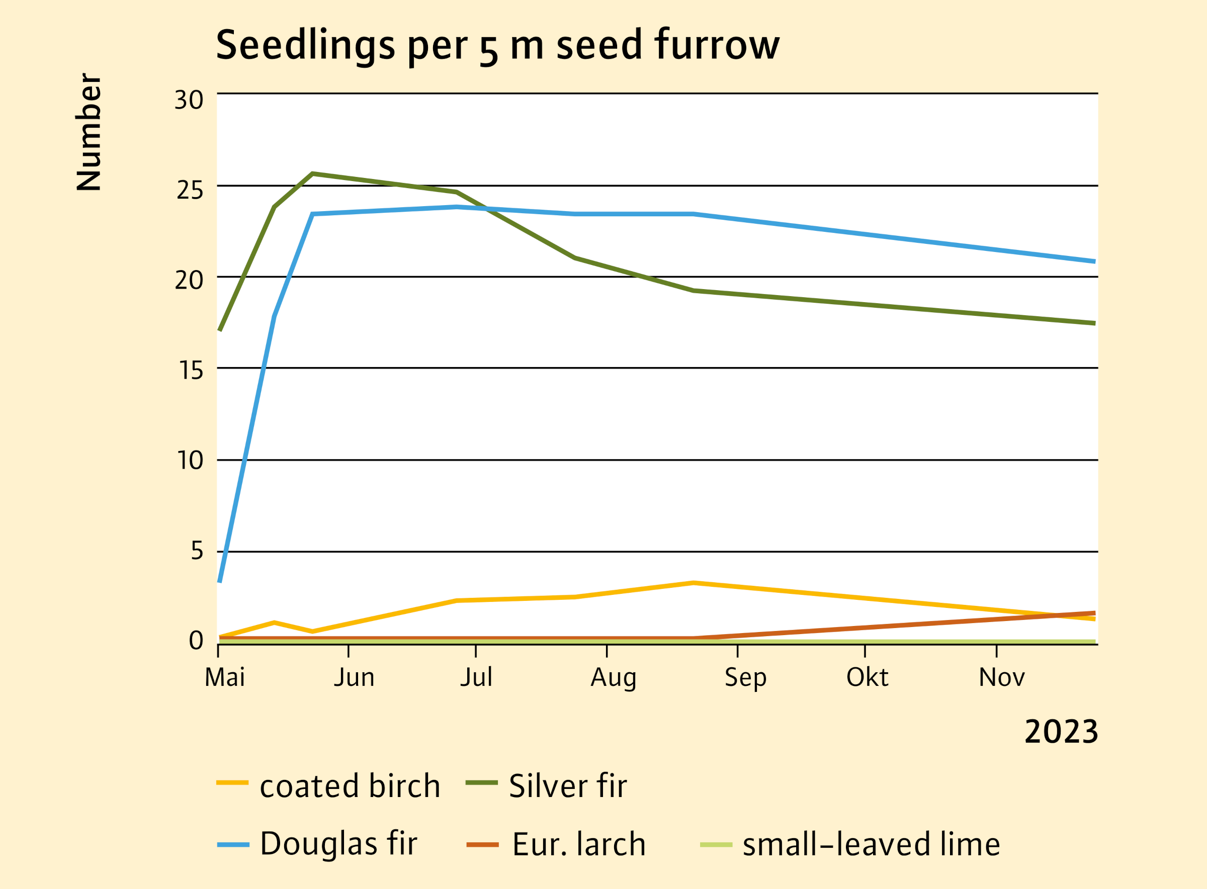 Numerous sown fir trees germinated as early as the beginning of May 2023, followed by Douglas firs and some larches. The first birch trees emerged in summer. As expected, the lime trees did not germinate immediately; this was expected to happen in spring 2024. Multiple counts in the seed furrows showed approx. 10 seedlings per linear metre in summer 2023. At a calculated 18,000 trees per hectare, this corresponds to around ten times the number in a plantation and is far higher than the expected final tree numbers. Figure 4 shows the preliminary emergence figures for the five tree species on the BiMiSa plots up to the end of November 2023.