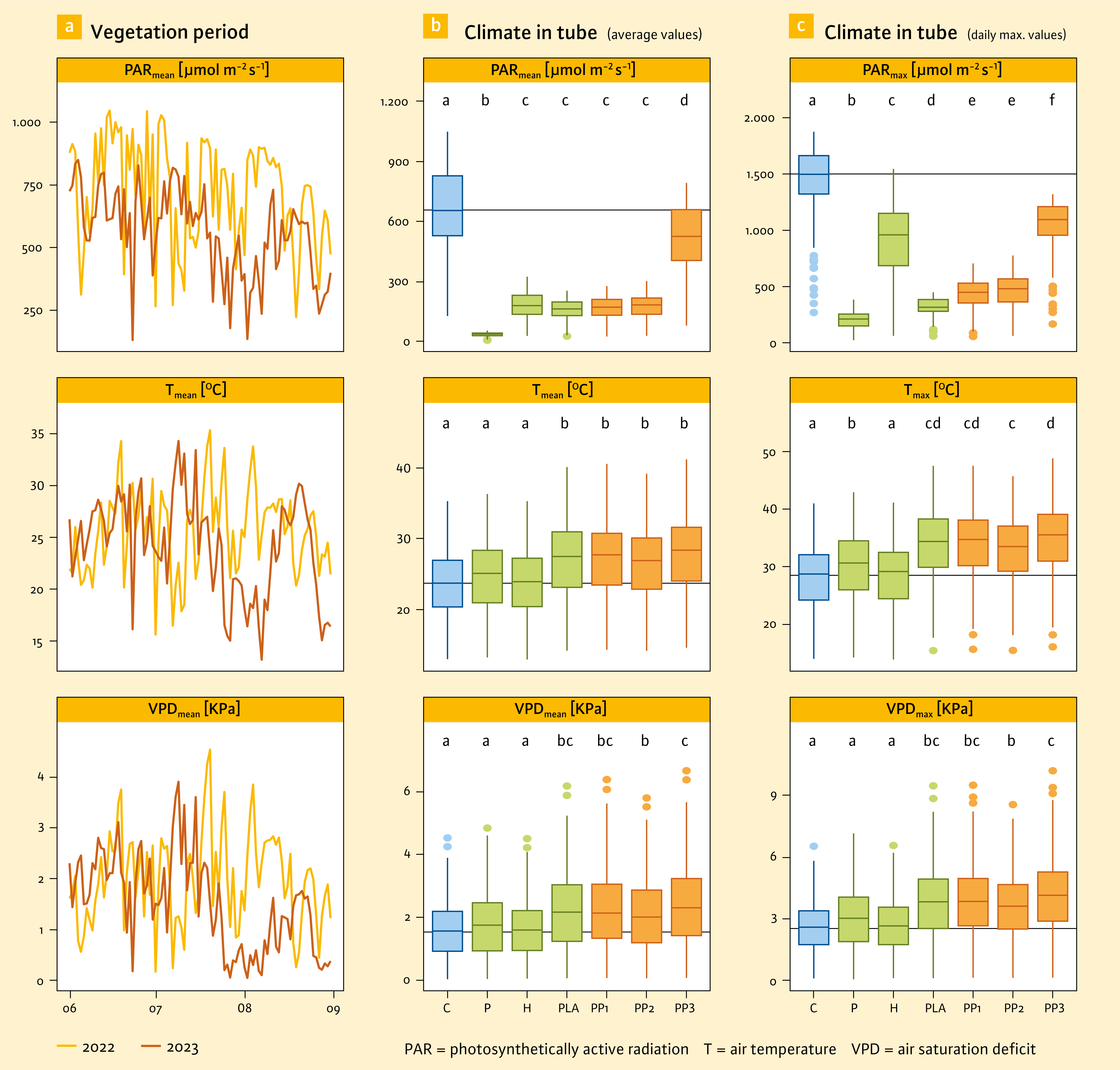 With the determined air temperature (Tmean) and the air saturation deficit (VPDmean), two groups could be identified over both vegetation periods. The biodegradable paper and wooden tree tubes were similar to the control group, while significantly higher values were achieved in the plastic tree tubes (Figure 3b). These differences were even more extreme when only the daily maximum was taken into account for the same study period (Figure 3c).