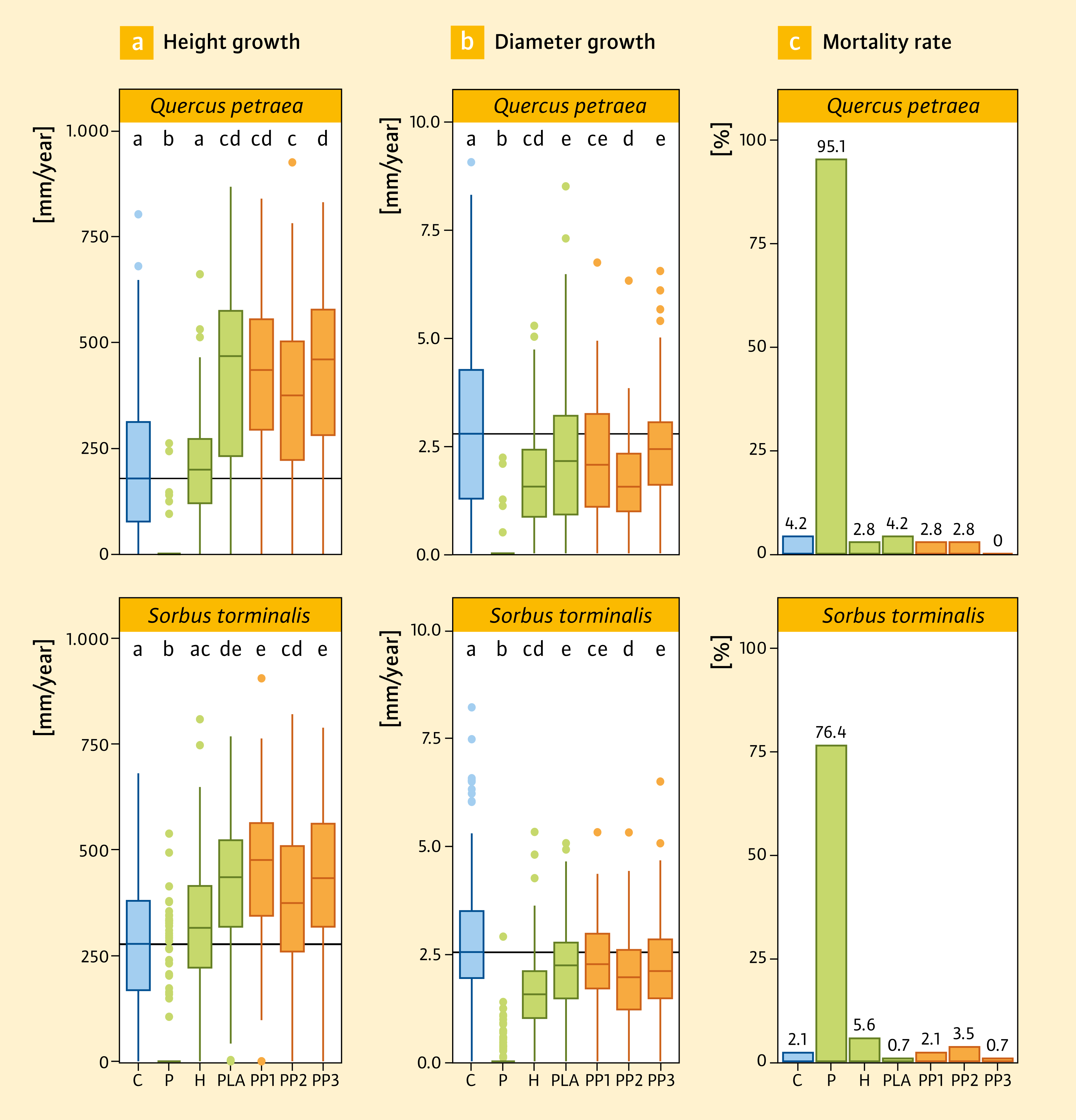 After two vegetation periods, the sessile oak saplings showed an average root collar diameter increment of 78.4 % (9.39 mm) and an average height increment of 204.6 % (95.8 cm), while the wild service tree saplings showed an average diameter increment of 70.7 % (9.67 mm) and an average height increment of 233.5 % (109.2 cm). Significant differences between the tree tube types were found for both tree species (Figure 4a,b).