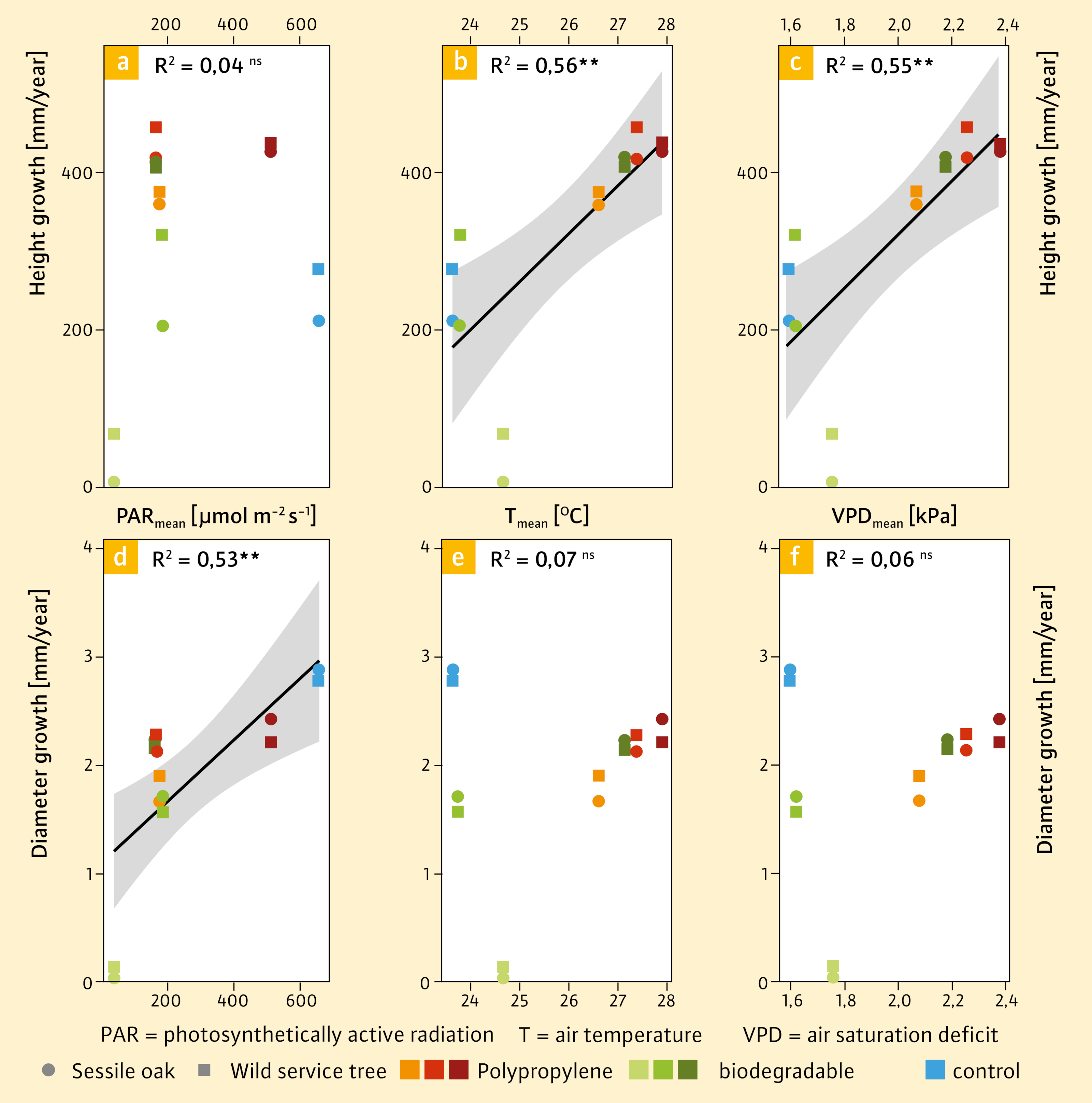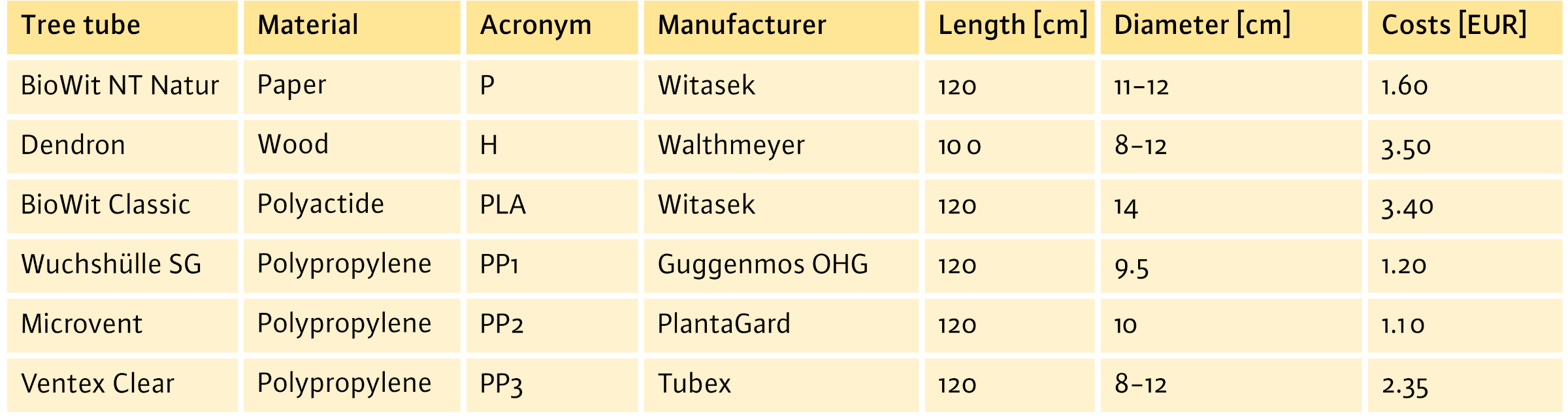 Plastic or bioplastic tree tubes were found to have a positive influence on height growth - despite the concentration of extreme climatic values inside the tubes. In order to reduce the further introduction of microplastics into forest ecosystems, however, the use of polypropylene tree tubes should be avoided. Until there is a standardised certification of the biodegradability of tree tubes under field conditions in forest ecosystems, it is therefore recommended that natural products made from renewable raw materials are used.