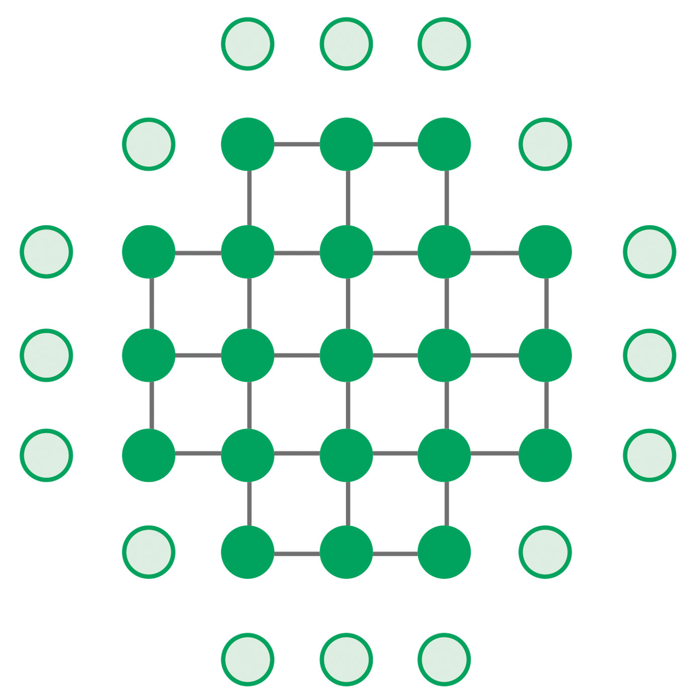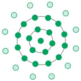 Fig. 3: Planting options for supplementary planting on succession areas: (From the left) circular cluster, square cluster, and “Nelderrad” method of planting in formation. The main tree species (target trees) are dark green; the secondary tree species (shade-tolerant deciduous trees and/or pioneer tree species) are light green. The diameters shown depend on the tree species: closer spacing for deciduous trees; wider for coniferous trees.