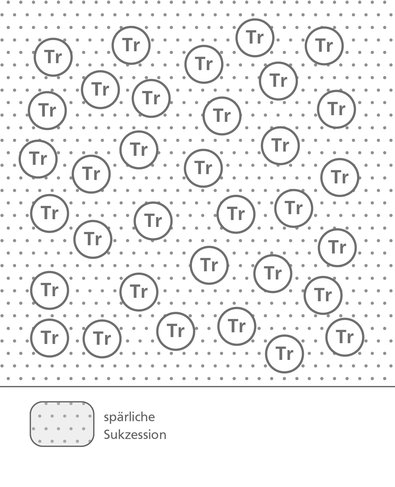 In the best case scenario, “cherries” in the form of small patches of target tree species to be promoted are distributed across the entire “cake” (area). These “cherries” need to be well marked and regularly monitored in subsequent years, because the tree species introduced there need to be intensively safeguarded and tended during the establishment phase and subsequent qualification and sizing stages. One advantage is the low cost of establishing the new culture, although there will normally be some investment in the continuous tending measures. During the tending measures, the pioneers immediately surrounding the target tree “cherries” have to be cut back far enough to allow the planted tree species to develop without restriction.