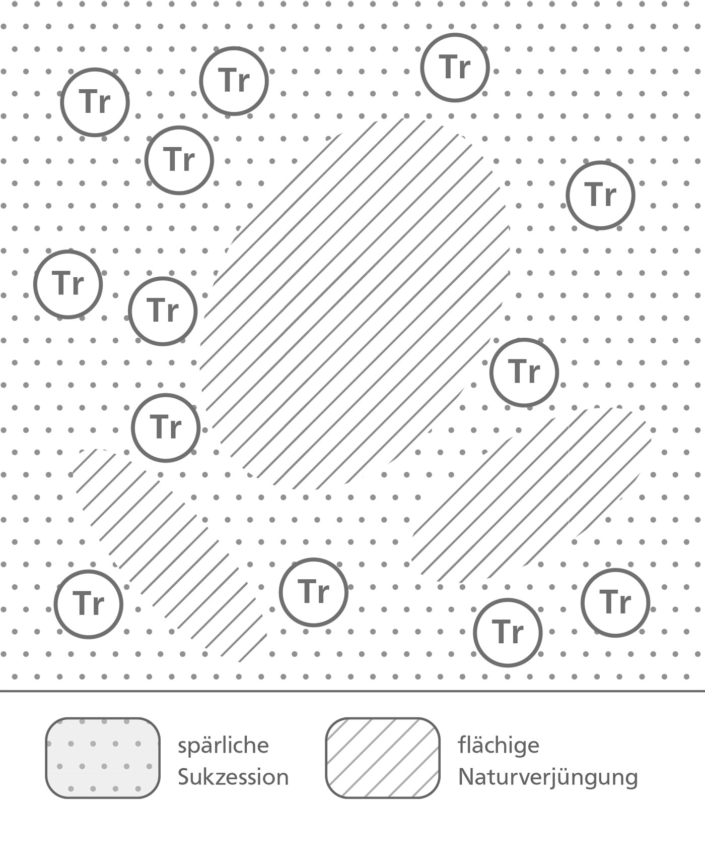 Natural regeneration and the closing of gaps on damaged or barren areas often do not take place evenly. Even if pioneer tree species frequently become established over large areas, there are often patches in between without regeneration. This can be exploited for silvicultural purposes: gaps or areas with low numbers of plants can be actively used to introduce the desired, climate-tolerant tree species appropriate for the site, through so-called supplementary or enhancement planting measures. In this case, the main tree species are not planted over extensive areas, but in patches. There are various methods for doing this, such as planting in clusters, clumps or “Nelderräder” [small groups of trees planted in particular formations].