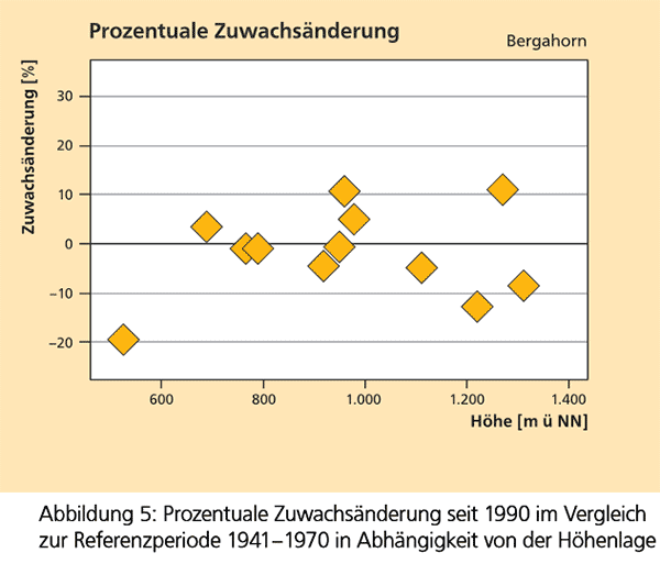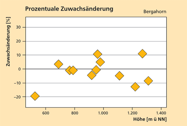 The rise in temperature of approx. 1° C since 1990 in the vegetation period is not however reflected in the annual ring widths in sycamore. In comparison with the reference period 1941-1970, no specific trend in growth change is to be detected (Figure 5). The duration and strength of the rise in temperature up to now have presumably not been considerable enough, or the growth of the sycamore is dominated on the studied sites by other factors (e.g. availability of nutrients).