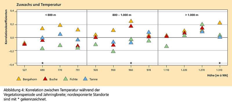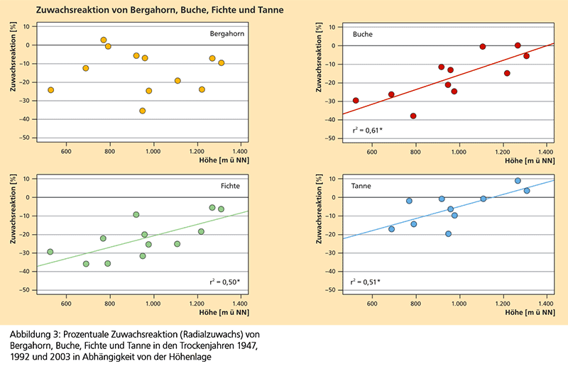 With the percentage change of the radial growth of sycamore, beech, spruce and fir in the dry years 1947, 1992 and 2003 (in comparison with the five previous years in each case), considerable differences between the tree species can be discerned depending on the elevation (Figure 3). With spruce, beech and fir, there is a significant correlation between the fall in growth and elevation.