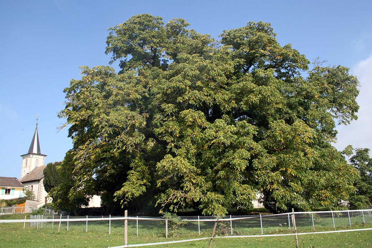 This term covers various natural and artificial crosses within the Juglans genus. They are interesting from a silvicultural point of view, as some of the cross progeny show better growth performance in the first generation than their parents (heterosis effect). The easily growing hybrids were obviously popular in parks and large private gardens in France and French-speaking Switzerland, because that is where the oldest known hybrid walnut trees are to be found. The first mention of a hybrid walnut came from France. This was a cross between black walnut and walnut, planted in 1815 in the park of the Vilmorin family near Paris, and named Juglans vilmoriana after its owner. The dying tree had to be felled in 1996. It had a BHD of 130 cm, a height of 32 m, a total volume of 18 m³, and a trunk volume of 8 m³ with a trunk length of 6 m. The name Juglans x intermedia was only introduced later. In Meinier, near Geneva, there is a mighty, solitary 155-year-old Juglans intermedia with an extremely broad crown (Fig. 2).