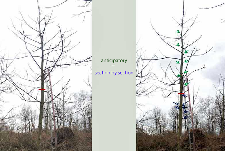 Traditionally, the branches are removed section by section, “from the bottom upwards”. Especially in the case of hybrid walnut trees, the branches in the upper part of the crown very quickly become very thick. This requires a different approach. This is why dynamic pruning, a combination of anticipatory pruning and section by section pruning, is often used in agroforestry (Fig. 12).