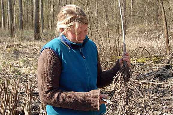 The planting of one-year-old walnut trees is recommended. The planting method should be chosen bearing the root length of the walnut trees in mind (approx. 50 cm!). It is possible to plant using a spade, planting auger or small excavator. Overly long lateral roots and damaged root parts should be trimmed with sharp secateurs (Fig. 6).