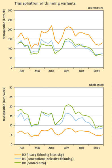 The comparison of the transpiration of the selected trees with that of the entire stand is interesting (Fig. 3). The selected trees in the heavily thinned areas transpired considerably more than the selected trees on the other measurement areas. The opposite is true if we consider the transpiration of the entire stand. The unthinned stand has by far the highest water consumption.
