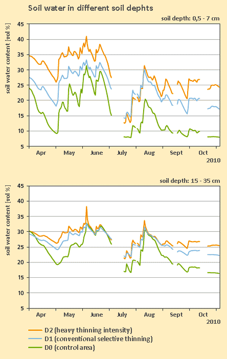 Initially, what was to be expected occurred: stand precipitation rose in the first two years. In comparison with the unthinned area, rainfall on the conventionally thinned stands increased in the year after the thinning by 11 %, and on the severely thinned areas by as much as 39 %. Supplemented by the lower overall level of transpiration, the soil humidity rose at all depths of the soil in the thinned areas above the level in the control areas (Fig. 2).