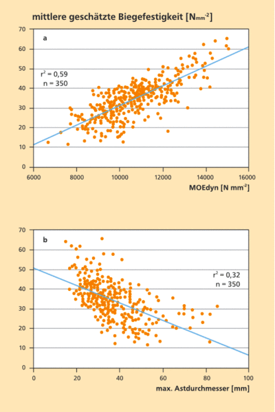 The sawn timber quality can be judged by using a suitable mechanical method to sort the roundwood, or by assessing the standing tree. The dynamic elasticity module (MOEdyn) of the short-wood logs correlates closely with the strength of the square-edged sawn timber and boards cut from them; if the roundwood is sorted visually, the maximum branch diameter also correlates well with the properties of the sawn timber (Fig. 2). Throughout the processing chain there are thus both classical and modern methods available for evaluating the timber quality, and this facilitates the efficient steering of the flow of roundwood and sawn timber, i.e. the allocation of timber to the appropriate use for the quality. The accuracy of the quality assessment improves over the course of the processing; at the beginning of the process there are however more possibilities open for the handling of the timber.