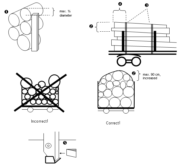 - When securing by two stakes, logs have to overlap the stakes by about 50 cm, with rough bark min. 30 cm (at shortwood loading the pluggable stakes of the Roos-wagons are helpful).