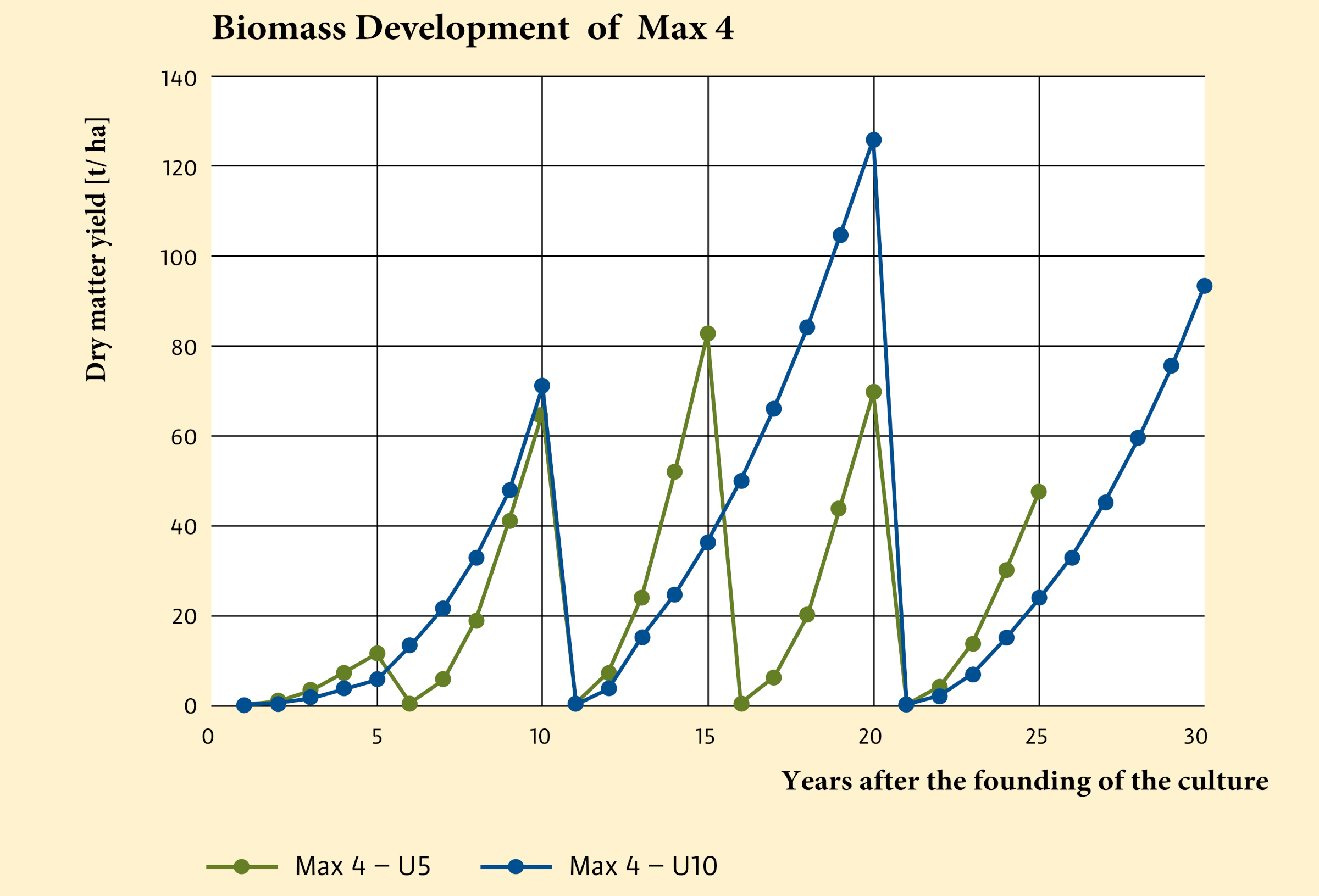 The calculation of the biomass development between harvests is based on data from Strobl (2007), who was able to draw on annual surveys of standing biomass in the first five years and use them to derive the percentage contribution of the individual growth years to the total biomass output. The yield data of the ten-year old Max clones were interpolated with the help of the biomass survey at the end of the ten-year rotation and the growth curves of the five-year old stand. It was assumed that if the number of plants were halved, the biomass growth in the first few years of growth would also be half of the growth determined in the five-year rotation.