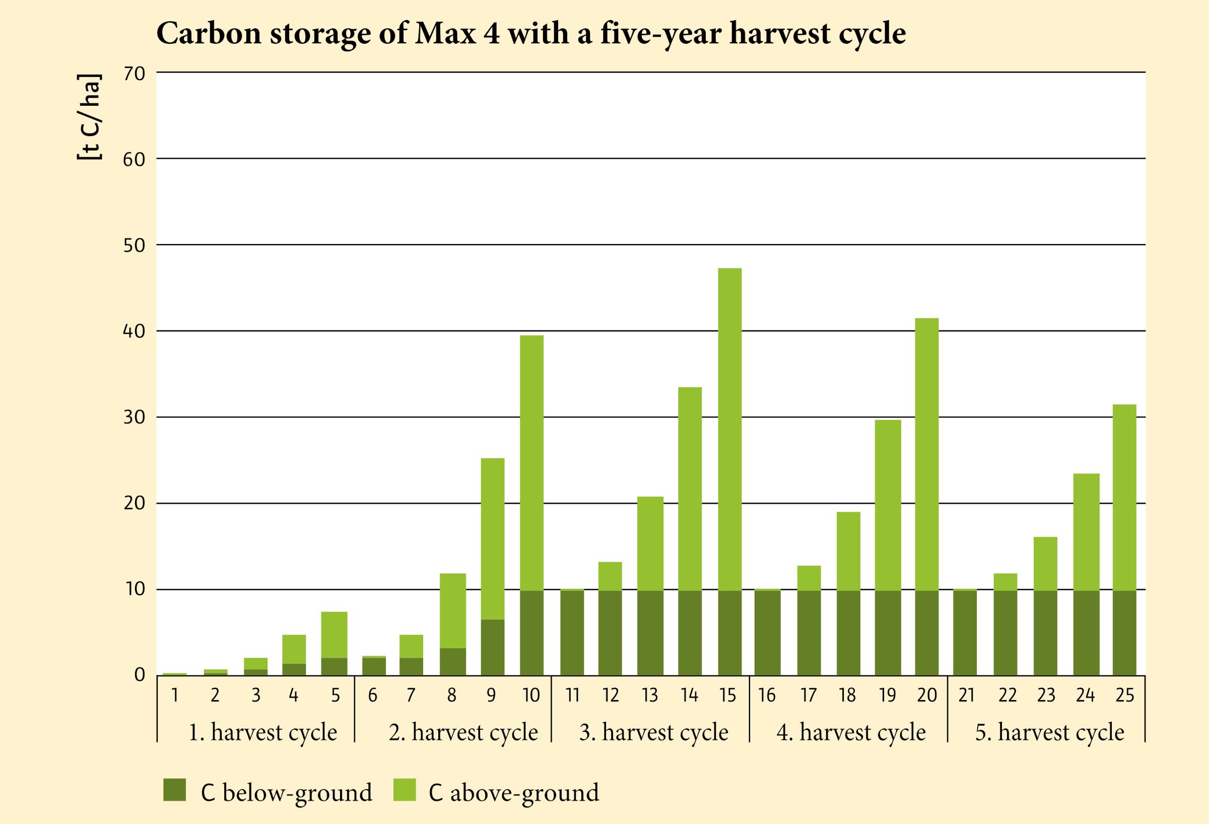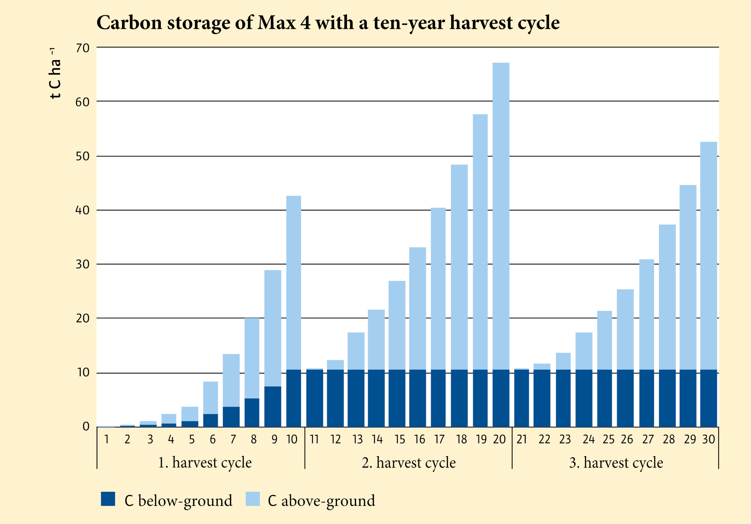 When the end of the rotation period is reached, the stand is cut back to the stump, i.e. the above-ground biomass is removed. The underground biomass remains intact. Our calculations were based on the assumption that the root biomass remains stable after 10 years of operation and is unaffected by fluctuations in the above-ground biomass.