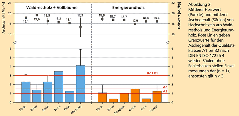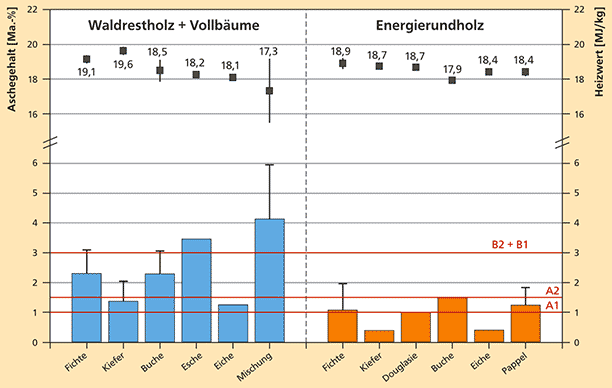 Fig. 2: Average calorific value (points) and average ash content (columns) of wood chips made from forest residual wood and fuel roundwood. Red lines show the limits for ash content for quality classes A1 to B3 according to DIN EN ISO 17225-4. Columns without error bars represent individual measurements (n=1), and otherwise n ≥ 3.