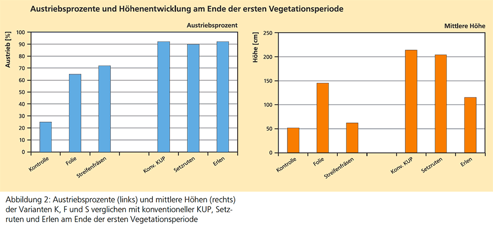 The percentage of cuttings sprouting is considerably better with Variant S. Here, an average of 72 % of the cuttings survived. However, the average growth to an average of 63 centimetres in height was only marginally higher than with the control system (K). The tilling of strips ensured that the cuttings had a good planting bed, but the competing grass was only held back for a relatively short time. After three to five weeks, the competition from understorey vegetation was already considerable. It is helpful to mow or to mulch between the planting rows at least once in the first vegetation period.